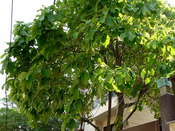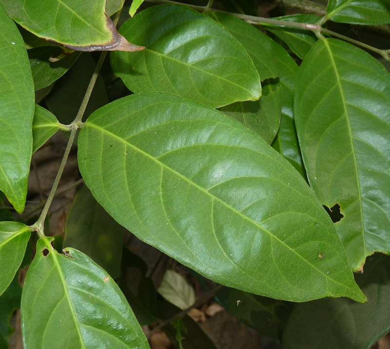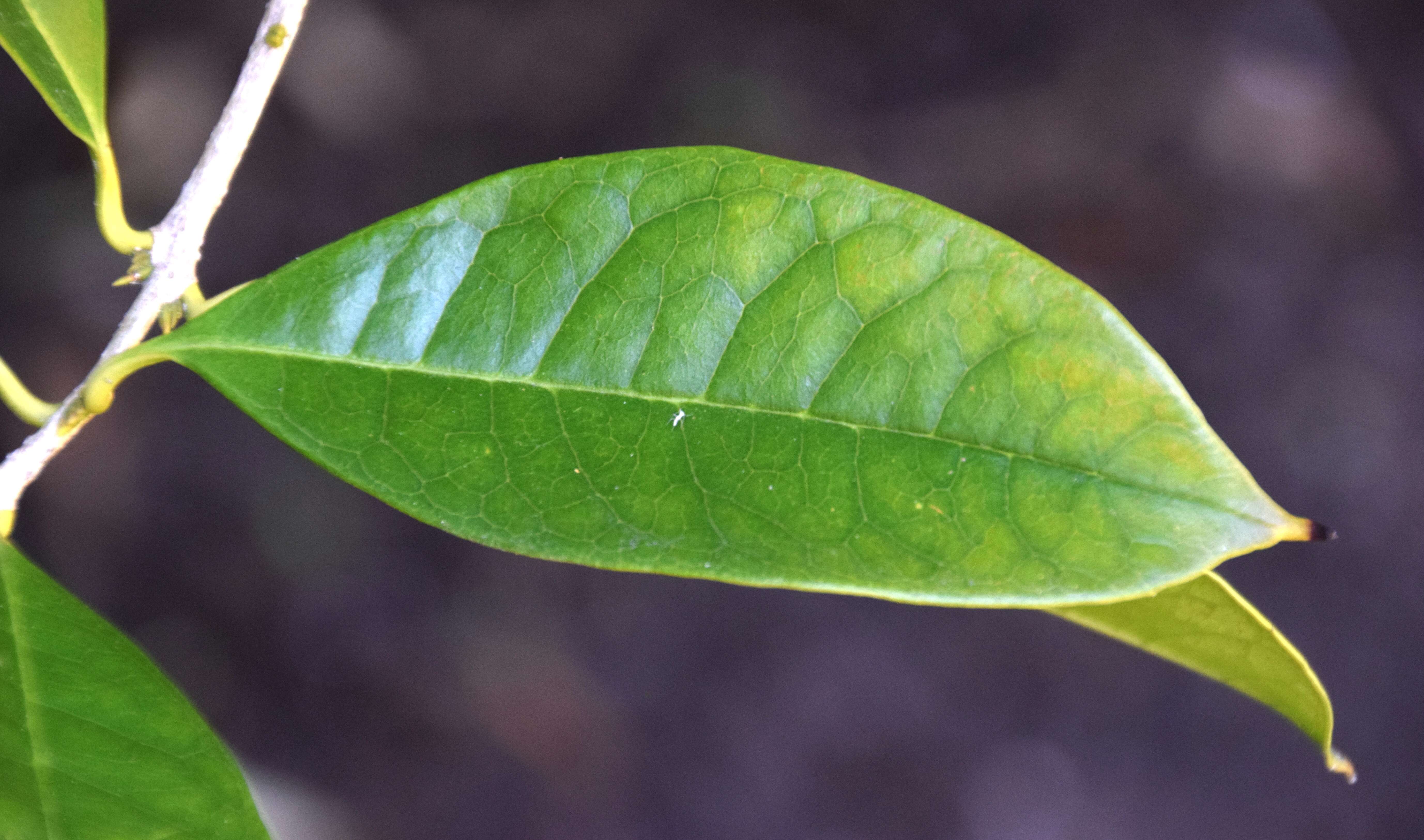 Leaves are simple, alternate, elliptically oblong to sub-rounded, 5 to 8 centimeters long, 2.5 to 4 centimeters wide; those toward the end of the branches are much smaller and veined. Petioles are about 7 millimeters long, with adnate spiculate stipules which frequently are extended into tendrils.
