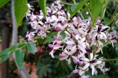 Inflorescence occurs on a long, axillary panicle up to 20 cm long. Flowers are small, numerous, pink to lavender, star shaped and produce a delightful chocolate scent. It is about 8 millimetres long, borne on the upper axils of the leaves. Sepals are 5-lobed, 1 cm long. Petals are 5-lobed, 0.9 cm long, pubescent. Staminal tube is deep purple blue, 0.5 cm long, 1 cm across. Petals are hairy. Flowering normally takes place in between March to May.