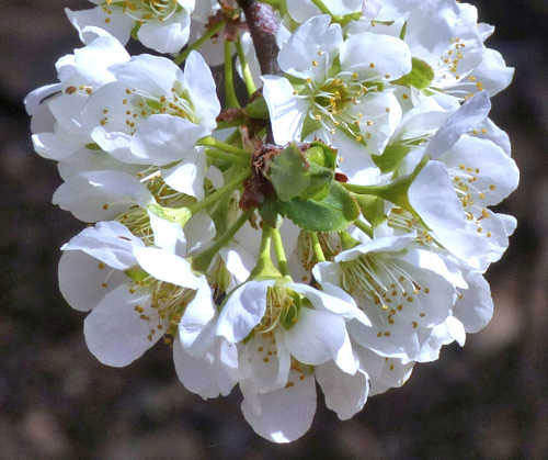 Chinese plum is a small deciduous fruit-bearing tree that grows up to 10 meters (33 ft.) tall. The plant is found growing in sparse forests, forest margins, scrub, along trails in mountains, beside streams in valleys, thickets, shrub land, open forest, hillsides and along the roadsides. The plant does best in well drained, deep, loamy soil rich in moderate organic content, (acidic to slightly acidic). Leaves are 6-12 cm long and 2.5-5 cm broad, with a serrated margin. Flowers are produced in early spring, 2 cm diameter with five white petals. Flowering normally takes place from April. Fertile flowers are followed by round to oval shaped drupe 4-7 cm in diameter with yellow-pink flesh. It can be harvested in the summer. The single seed is enclosed in a hard woody shell. The fruit has yellow or red flesh, with many shades of both colors and some cultivars having a combination of both yellow and red flesh.