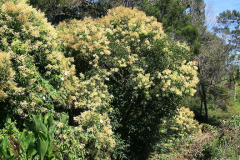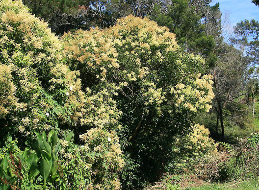 Chinese privet is a small to medium, hardy, fast-growing, deciduous, semi-evergreen, or evergreen shrub or round-headed tree that normally grows about 4-12 m tall with a 8 -12 m spread, but occasionally a large tree reaching up to 25 m in height. The plant is found growing in forests, forest edges, coastal cliffs, waste places, margins of remnant forest stands, gardens, roadsides, river valleys, open woodlands, grasslands, rainforests, disturbed areas, alongside waterways, rainforests, gullies, creek banks, pastures, wet forests, farm hedgerows, shrub lands, gardens, riverbanks, wetlands and coastal dunes. Its root system is shallow but extensive. Suckers are readily produced and the plants can spread vegetatively in this fashion. The plants branch abundantly and the branches typically arch gently downward. Its twigs are usually densely hairy (pubescent) when young and the plant hairs (trichomes) spread at right angles from the twig surface. Raised, tan-colored lenticels are also evident on the twig’s surface.