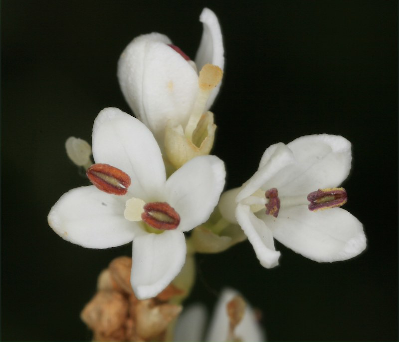 The flowers occur in numerous, cone shaped, branching clusters (panicles) two to four inches long that profusely cover the shrub when flowering. Short, slender stalk (pedicel) supports each flower. The small flowers are about 6 mm across and are white or cream in color and have four petals (2-5 mm long) that are fused at the base into a very short tube (i.e. corolla tube). They also have four tiny sepals (1.5-2 mm long) and two stamens. These flowers are borne in large branched clusters (8-25 cm long) at the tips of the branches (i.e. in terminal panicles). They are borne directly on the branches of the flower clusters or on short stalks (i.e. pedicels) 1-3 mm long (i.e. they are sessile or sub-sessile). The flowers produce a somewhat disagreeable aroma. Flowering occurs mostly during August to September.