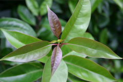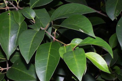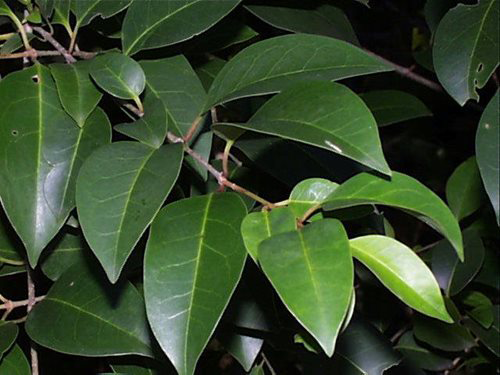 Leaf Leaves are evergreen to semi-deciduous and are oppositely arranged (two leaves per node) along the stem on nodes that are usually less than one inch apart.  The leaves vary from egg-shaped in outline (i.e. ovate) to oval (i.e. elliptic) in shape and are borne on short stalks (i.e. petioles) 10-30 mm long