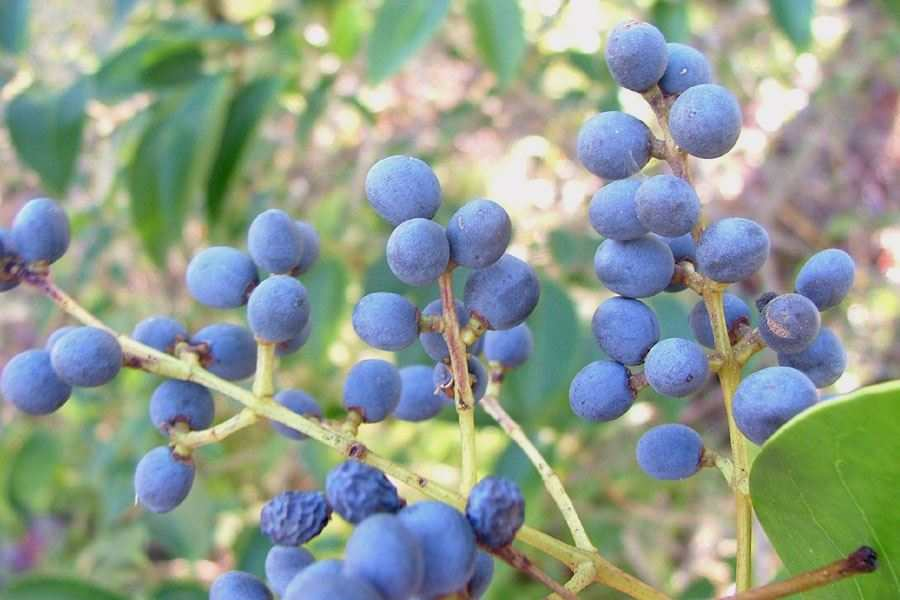 Fertile flowers are followed by small fruit that is 5-10 mm long and 4-6 mm wide and are berry-like (actually drupes). They are initially pale green turning to bluish-black or purplish-black in color as they mature. These fruit are oval (i.e. ellipsoid) or round (i.e. globular) and each usually contains two seeds. The seeds have a ribbed surface and are about 5 mm long. Fruit are present during autumn and winter.