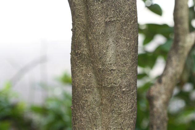 The stems and leaves are hairless (i.e. glabrous) and the younger stems are rounded (i.e. terete) and greenish in color. Older stems and branches usually develop a relatively smooth greyish-coloued bark as they mature, which is loosely covered with small white raised structures (i.e. lenticels). However, the fruit-bearing branches often turn orange or reddish in color.