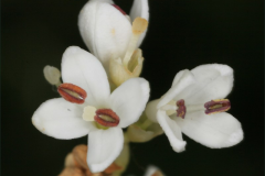 Flower Flowers are about 6 mm across and are white or cream in color and have four petals (2-5 mm long) that are fused at the base into a very short tube (i.e. corolla tube). They also have four tiny sepals (1.5-2 mm long) and two stamens.