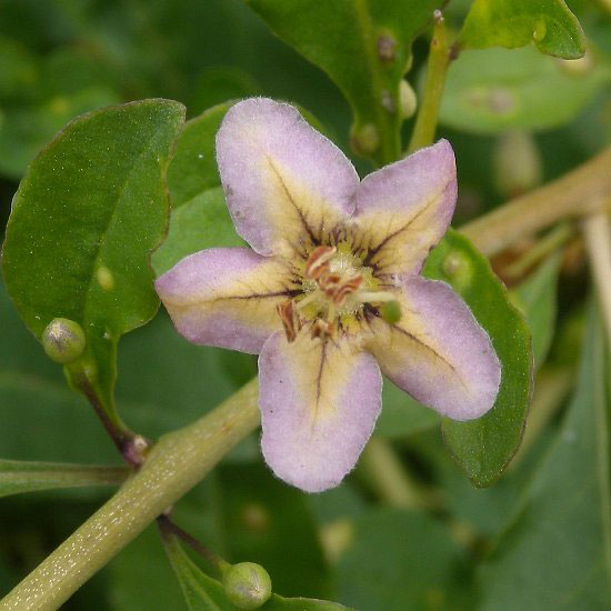 Solitary or clusters of 2–3 flowers occur from the axils of leaves on hairless light green petioles 1–2 centimeters (0.39–0.79 in) long. Each flower is about ¾ inches long and similarly across, consisting of a bell-shaped (campanulate) light green calyx with 3–5 teeth, a lavender corolla with 5 spreading rounded lobes, 5 exserted stamens with brownish anthers, and an ovary with a single exserted white style that terminates in a swollen light green stigma. The base of each corolla is short tubular-funnel form; it is about the same length or a little shorter than its spreading lobes. The throat of the corolla and the interior of its lobes have dark pinnate and radiating veins, and sometimes the area around these veins is pale with light brown, yellowish, or greenish tints. Flowering normally takes place from June to August.