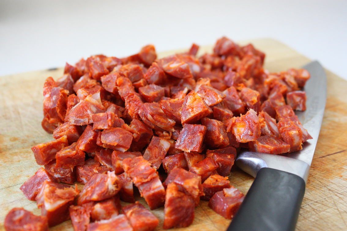 Chorizo is a form of pork sausage which uses natural casings that are made from intestines. It is a common method used since the time of Romans. Chorizo in Europe is fermented, smoked and cured which is sliced and consumed without cooking or added as an ingredient for adding flavor to other dishes. In some places, sausages sold as chorizo may not be cured and fermented and needs proper cooking before consumption. Portuguese chourico and Spanish chorizo gets its distinctive smokiness and also deep red color from smoked, dried and red peppers.