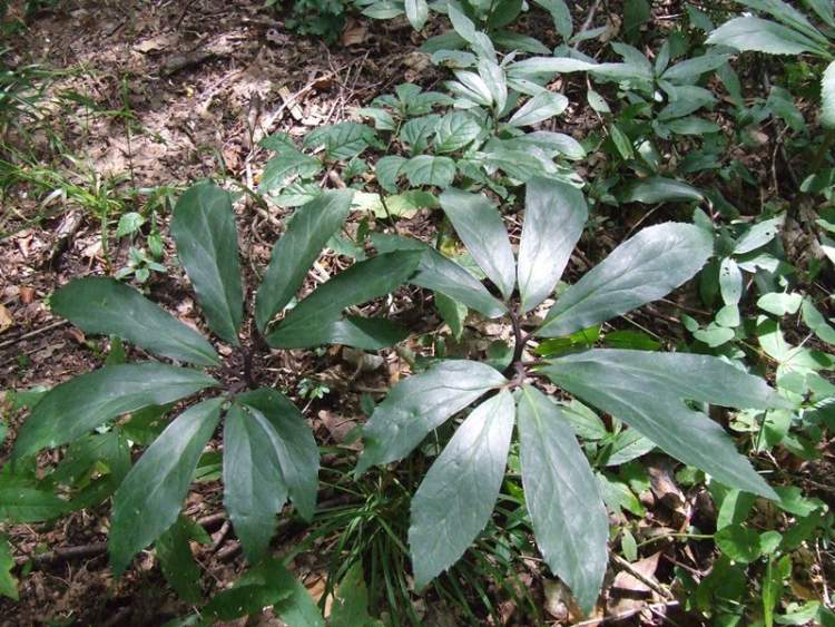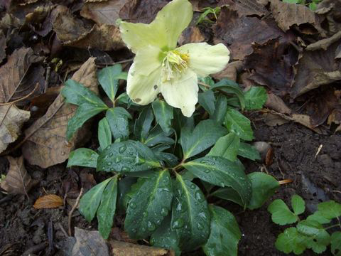 Christmas rose (Black Hellebore) is an evergreen perennial low-growing flowering plant that grows about 9–12 in (23–30 cm) tall. The plant is found growing in moist, organically rich, humusy, and neutral to alkaline, well-drained soils in part shade to full shade. Roots are short and black. The stem is erect, glabrous, branched, woody at the base and almost leafless. The leaves are basal, persistent, alternate, palmately cleft, with long petioles. They consist of 7-9 leaflets which are dark green, shiny, tough, narrow and lanceolate. Leaves are glabrous, dark green above with a lighter underside. In the St. Louis area, leaves remain evergreen in moderate winters, but may become somewhat tattered in extremely cold winter areas where temperatures dip below zero, particularly if foliage is not protected by snow cover.