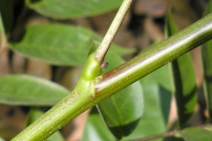 Leaves are lanceolate or ovate-lanceolate, bipinnately compound, and about 20 to 25 cm in length. Each pinna has four to seven pairs of leaflets, which are 3 to 9 cm in length, and 2 to 4 cm in width, and arranged oppositely. Leaflets are ovate or ovate lanceolate in shape with a long, fine pointed tip and is green in color. The leaflets have an entire leaf margin. The leaf apex is acuminate and has fine hairs on the margins of the leaflets. A conspicuous, dark-colored gland occurs at the base of the petiole (leaf stalk) but not on the stalks of the leaflets. It is located about 0.3 to 0.5 cm from the base of the petiole. On crushing of the leaf, there is a fetid smell which is a characteristic of the herb.