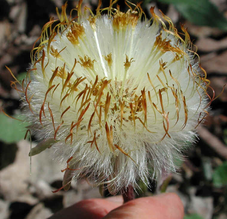 Flowers look alike common dandelion which are small with disc florets and yellow ray florets. Ray florets are fertile whereas disc florets are sterile. Each flowers measures about 0.6 in. (1.5 cm) across that is surrounded by an involuntary bracts. It consists of five stamens. The flowers bloom in early spring. The stems of flowers comprises of wooly hairs and scaly bracts and measures 5-15 cm (2 to 6) inches high.