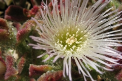Each flower appears singly and has numerous thin petals, 5 sepals, and many short stamens. The flowers are 30–50 mm across and the color of the flowers ranges from white to pink to mauve. The flower stalks are also succulent, with the crystals ranging from green to red, however, this varies from location to location. Flowers are hermaphrodite (have both male and female organs) and are pollinated by Insects. Flowering normally takes place from July to September. Flowers open in the morning and close at night.