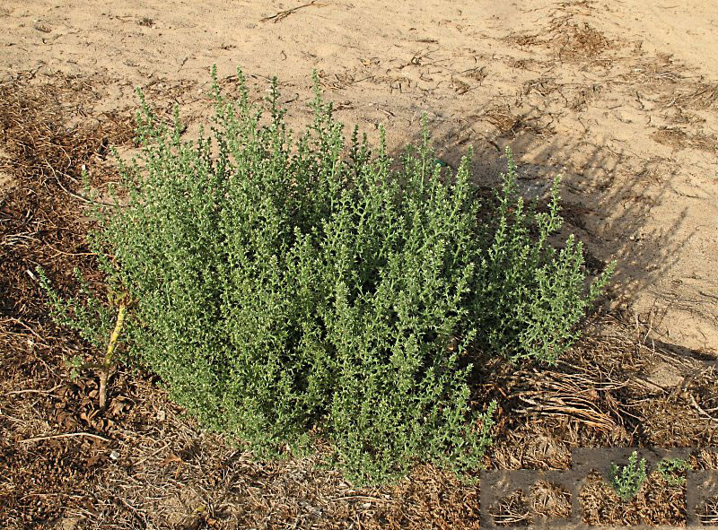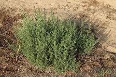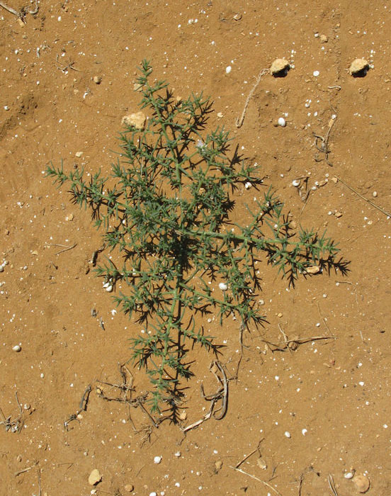 Common saltwort is an exotic, annual, erect, xerohalophytic forb. It is highly branched and rounded in form, growing from 1 to 3 feet (0.3-1 m) in height and from 1 to 5 feet (0.3-1.5 m) in diameter. The plant is found growing in roadsides, disturbed areas, scrub vegetation, on former sugarcane fields, heath, shrub land and coastal areas, fallows, agricultural land, range land, abandoned fields, overgrazed pastures, shingle and sand behind beaches, dry gravelly sites, railways, and other dry, stony and sandy areas. It can be found growing in any type of well-drained, uncompacted soil with a sunny exposure. It is most frequent, however, in alkaline or saline soils due to reduced competition. Stem is erect, rarely ascending, profusely branched from or near base (rarely simple in underdeveloped specimens). Branches are arcuate, proximal ones occasionally prostrate.