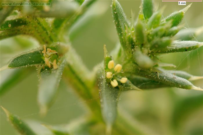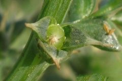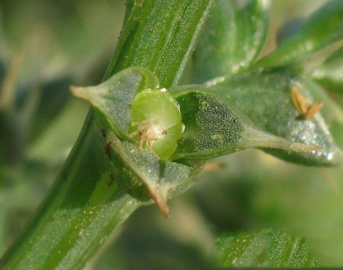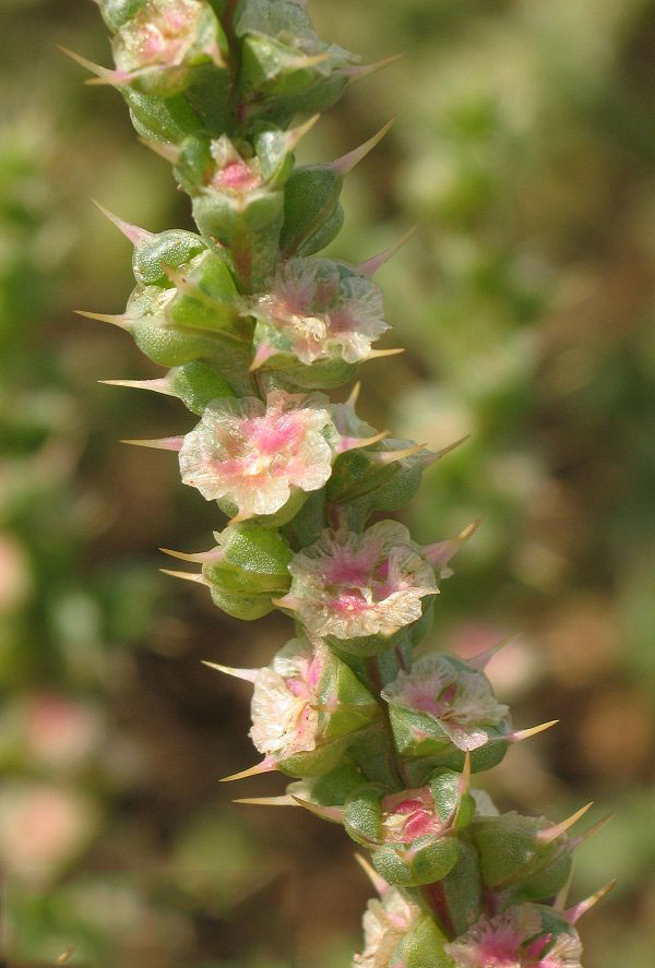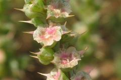 Flowering occurs from midsummer to fall, when small, pink to greenish flowers develop from the leaf axils. Each flower is subtended by 3, spine-tipped leaves. Fertile flowers are followed by fruits that are 0.19-0.31 in. (4.8-7.9 mm) in diameter including the wings. Wings are opaque with smooth margins and veins. Seeds are cone shaped coiled utricle, 2 mm in diameter, dull brown to grey in color