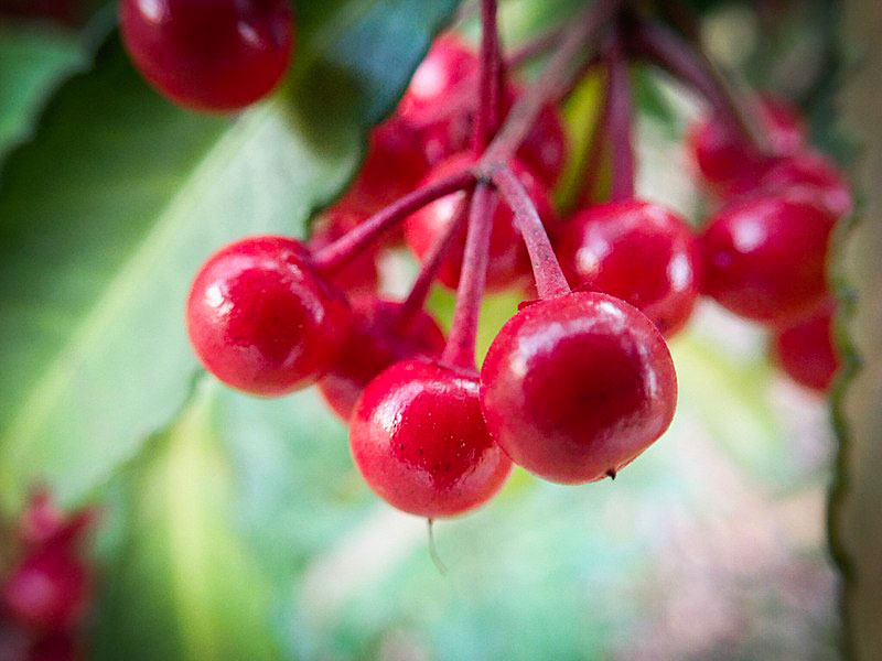| Shapes | Showy bright berries actually drupes that are rounded (i.e. globose) in shape, glossy in appearance, and 5-8 mm across. |
