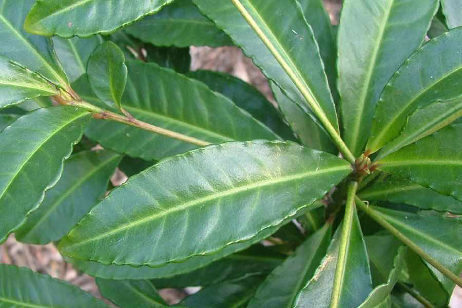 | Leaf | Simple leaves are 5-20 cm long and 1-4 cm wide and are alternately arranged and dark green in color. They are relatively thick and leathery in nature and narrowly oval or elongated in shape (i.e. elliptic-lanceolate or oblanceolate |