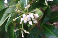 The flowers are small, white to reddish-pink in color, and fragrant. They are borne in clusters on flowering branches 4-16 cm long. These flowering branches usually divide into several smaller branches (i.e. rays) 2-4 cm long, each of which bear numerous flowers on stalks (i.e. pedicels) 5-10 mm long, which elongate further when in fruit. The flowers are 4-6 mm across and usually have five small sepals (1-2.5 mm long) with rounded tips (i.e. obtuse apices), five petals, and five stamens. The five white, or occasionally pinkish, petals are about 4 mm long and are slightly joined together at the base and have pointed tips (i.e. acute apices). Under close inspection, numerous tiny black spots can be seen on the flowers when they are young (i.e. they are black punctate). Flowering normally starts from April to October.
