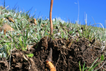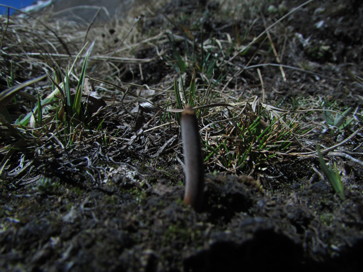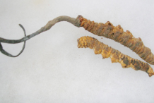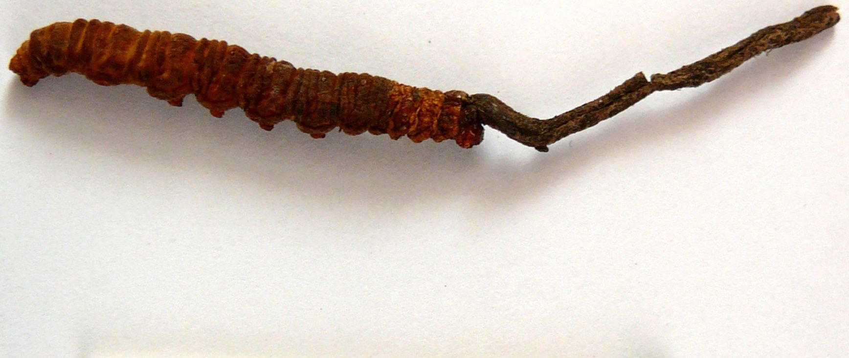 Ophiocordyceps sinensis consists of two parts, a fungal endosclerotium (within the caterpillar) and stroma. The stroma is actually the upper fungal part and is dark brown or black, but can be a yellow color when fresh, and longer than the caterpillar itself, usually 4–16 cm (1-6 inches). It grows singly from the larval head, and is clavate, sub-lanceolate or fusiform, and distinct from the stipe (stalk). The stipe is slender, glabrous, and longitudinally furrowed or ridged.