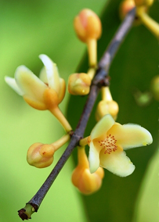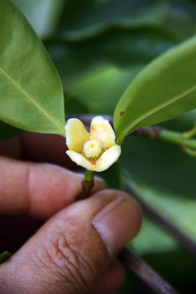 The genus Garcinia belongs to Clusiaceae family. The trees are small to medium sized reaching to the height of 30 meters and widely distributed in the tropical regions of the world. Cowa Mangosteen is inherent to East India, Myanmar, Nepal, Thailand, Laos, Kampuchea, Northern Peninsular Malaysia and Vietnam. It is also found in Anadaman, Nicobar Islands and South and West Yunnan in China. This evergreen tree has the bole of 15-20 cm diameter. The bark is dark brown with lemon yellow exudates. Leaves are simple, entire, opposite, 6-15 by 2.5-6 cm, broadly lanceolate to lanceolate-elliptic, thick, glossy green and tapering to both ends. Male flower have four yellow peals which is flushed with pink. Female flowers are solitary, axillary with staminodes united in lower half. Fruits are oblique, sub-globose-globose and 5–6 × 4–5 cm in diameter. Fruits are green when young and turn dull orange or yellow when matured. Seeds are large, trigonous and embedded in pale orange pulp.