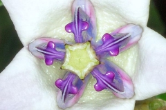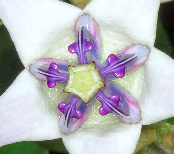 About five stamens are inserted at the base of the Coro. Filaments united to form a large stamina column provided  with  five  conspicuous radiating  coronal appendages  that  are completely adnate to,  but slightly  shorter  than the  column.  The appendages are fleshy, pale purplish or yellowish white and laterally compressed with a circinnately recurved hollow corsal spur at base and two short obtuse obliquely divergent cuticles towards the top just below the apex. Anthers are short, broad, and somewhat horny with broadly triangular membranous anther tips that are inflexed over the sides of the stigmatic hood. Flowering normally takes place from March to October.
