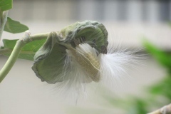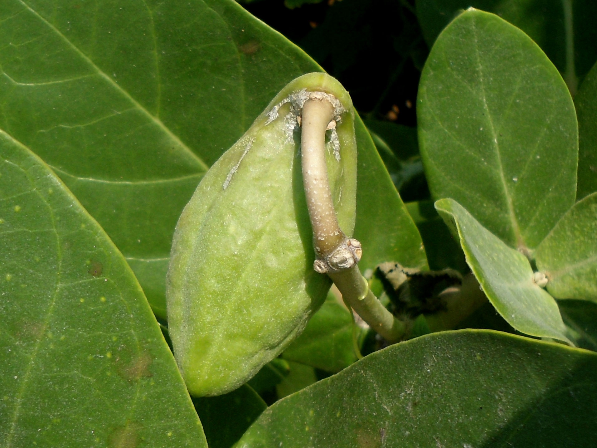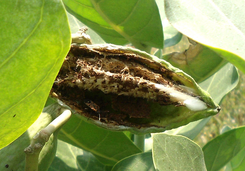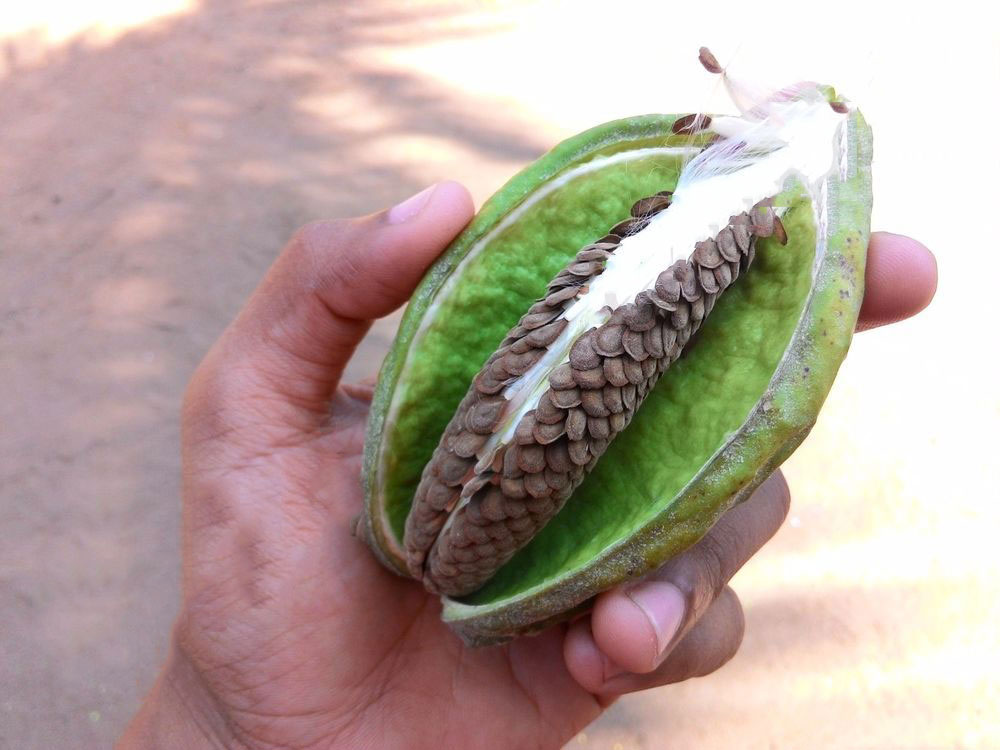 Fertile flowers are followed by spongy, ellipsoid follicles in pair, curved, 5-10 cm long and of 2.5-5 cm of diameter, containing several seeds. They split opens to release ovate, flat seeds, about 0.6 cm long and 0.4 cm broad, equipped at one end with a tuft of silky hairs, 2-4 cm long, that favor their dispersion through the wind.