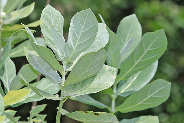 The opposite leaves are oblong obovate to nearly orbicular, short-pointed to blunt at the apex and have very short petioles below a nearly clasping, heart-shaped base. The leaf blades are light to dark green with nearly white veins. They are 7 to 18 cm long and 5 to 13 cm broad, slightly leathery, and have a fine coat of soft hairs that rub off. Leaves are pale green above, whitish green below, due to the presence of a fine down, and with prominent veins. The tender leaves are covered with ashy gray pubescence. Mature leaves are nearly smooth or even glabrous.