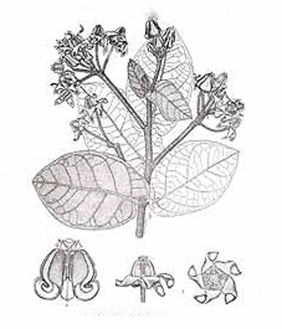 The inflorescences, on a robust, 5-16 cm long, peduncle, are axillar umbelliform cymes bearing numerous flowers, on a 2-5 cm long tomentose pedicel. Flowers are regular, bisexual, liliac or pale rose, purple or light greenish yellow and have a faint odor. They  are  arranged  in  simple  or  rarely compound cymose corymbs at the ends of laterally  placed  or  interpetiolar  peduncles arising from  alternate  sides  of  the  nodes.  Each cluster is surrounded by an involucre of several small oblong pointed scaly caducous bracts.  Flower buds are ovoid.
