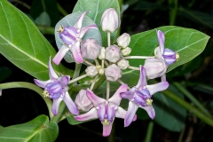 Calotropis gigantea, commonly called crown flower or giant milkweed, is a large shrub or small tree belonging to Asclepiadaceae or Milkweed or Ak family which includes 280 genera and 2,000 species of world-wide distribution but most abundant in the sub-tropics and tropics, and rare in cold countries. The plant is native to continental Asia and South-East Asia and has been introduced in the Pacific Islands, Australia, Central and northern South America and Africa as an ornamental near villages and temples and as a weed. In Africa it is recorded from Gabon, DR Congo, Sudan, Kenya, Tanzania, Angola and Mozambique, as well as from Seychelles and Mauritius.