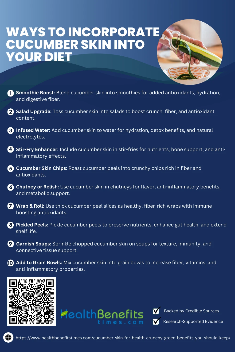 Adding cucumber skin to smoothies enhances antioxidant intake due to its rich polyphenol content. The peel provides hydrating electrolytes and silica for skin health. Its fiber also improves digestive efficiency during metabolism.