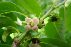 Date plum is a dioecious plant with male and female flowers growing on different trees. Male flowers are produced on shoots in groups of up to three, while the female flowers are solitary and hang down in rows, both of which bloom from June to July. Calyx with 4 short, acute, ciliate lobes is villous within. Corolla is reddish or greenish-white, with recurved, rounded, ciliate lobes 1/2 as long as the tube. At least both a male and female plant will be required to get seeds. However, the female tree can produce seedless fruits in the absence of a pollinator.