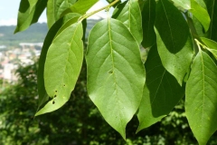 Leaves are shiny, leathery, and elliptical to oblong, rounded to broadly cuneate at base, up to 6-12 cm long and 2.5-5 cm wide with pointed ends and pubescent underside. They do not become yellow in autumn, although they fall with the first cold days of this season.