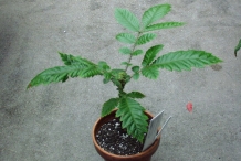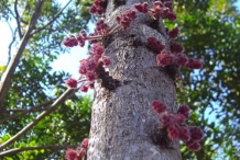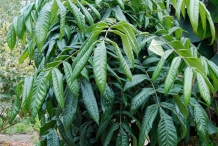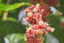 The small, slender, ornamental tree can naturally reach upto 6-12 m high. It has alternately arranged, pinnate, cordate to suborbicular green leaves which is upto 18-35(-46) cm long and (6-)8-12(-16) cm wide. The tree has recurved, dark pink flowers of 5-8 mm long which flowers between November to February and later converts into a fruit. Fruit are dark burgundy drupe (berries), obovoid or ellipsoid, compressed; 3.8–6.0 cm long and 3.0–5.3 cm wide. The fruit’s flesh is usually dark red colored. The bark is brown to dark grey and flaky.