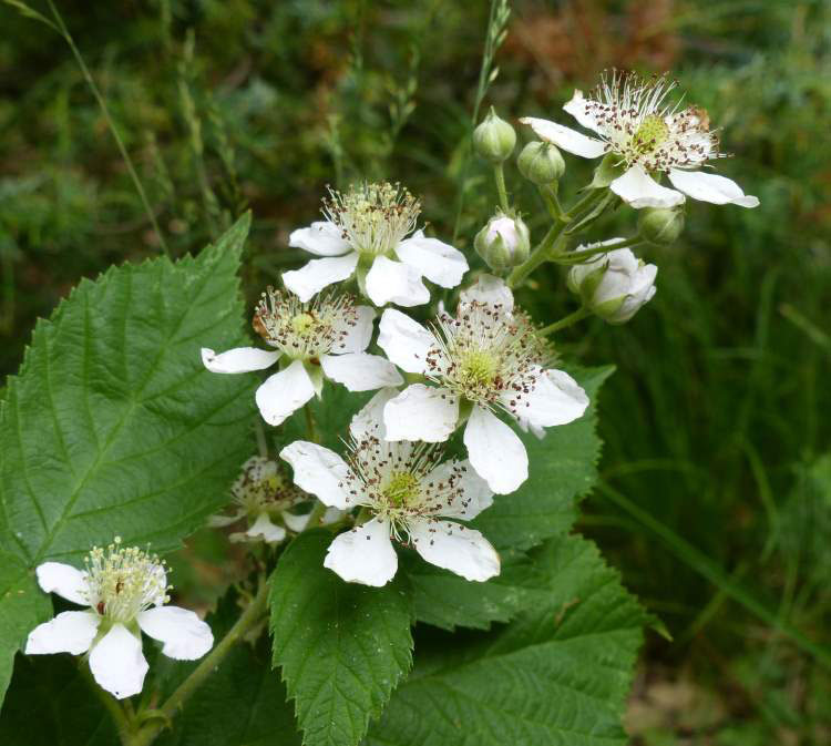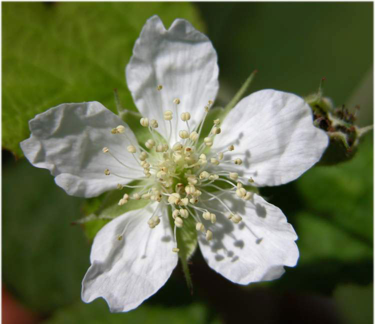 The corymbose inflorescence can be axillary or terminal and bears at least 10 flowers. The terminal inflorescences (up to 14 cm long) are longer and bear more flowers than the axillary inflorescences. The inflorescences are almost perpendicular to the floricanes. The pedicel (1-1.5 cm long) and rachis are pubescent, often glandular, and armed with very small prickles. The broadly lanceolate bracts are pubescent or glandular pubescent, 0.5-0.8 cm long and 0.1-0.2 cm broad. The perfect, white flowers are up to 6 cm across and have a 5-parted calyx and corolla. The outer surface of the calyx is pubescent, and occasionally armed with minute prickles. Sepals are long acuminate, 0.6-0.8 cm long and 0.3-0.5 cm wide. The white corolla is glabrous, and the obovate petals are basally clawed, 0.8-2 cm long. Stamens are numerous, borne on a hypanthium, relatively shorter than the petals, but often longer than the glabrous pistils. Numerous ovaries are unilocular and bear 2 ovules, of which only one will become a seed, the styles are filiform and stigmas capitate. Flowering normally takes place from June to September.