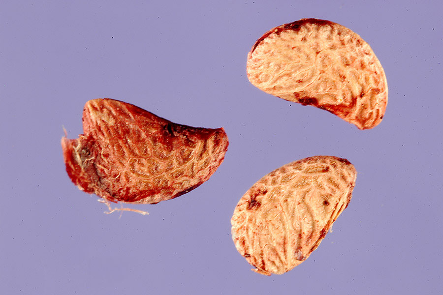 The fruit is a glaucous, bluish-black aggregate of few fleshy drupelets with a bluish waxy bloom. Drupelets are covered by blue cuticula and cannot separate from their fleshy receptacles readily. The drupe is approximately 1 cm in diameter, and nearly round. The drupelets are irregular sized, and each contains one seed. Each fruit consist of not more than 20 drupelets. The single drupelet is composed of three layers: external: thin exocarp, medium: fleshy mesocarp and internal: hard endocarp. Each drupelet has one hard seed inside. The reticulate seeds are rather hard and heavy (0.37 g), and are 2.2-3.2 mm long and 1.3-2 mm wide. The seed coat is composed of three layers: exotesta, mesotesta and internal endotesta.