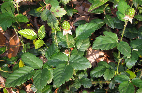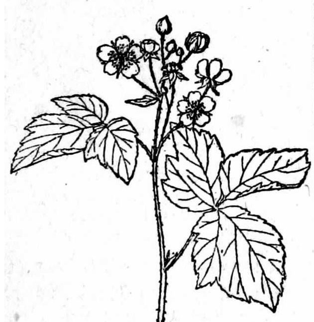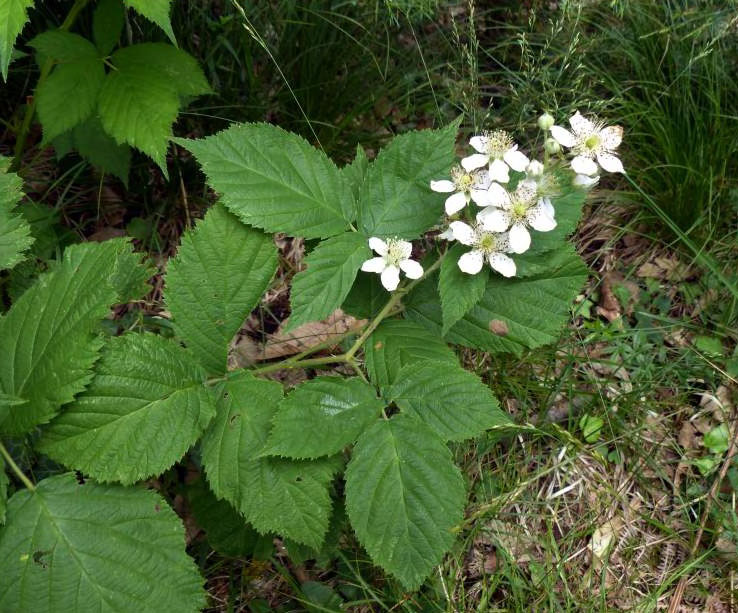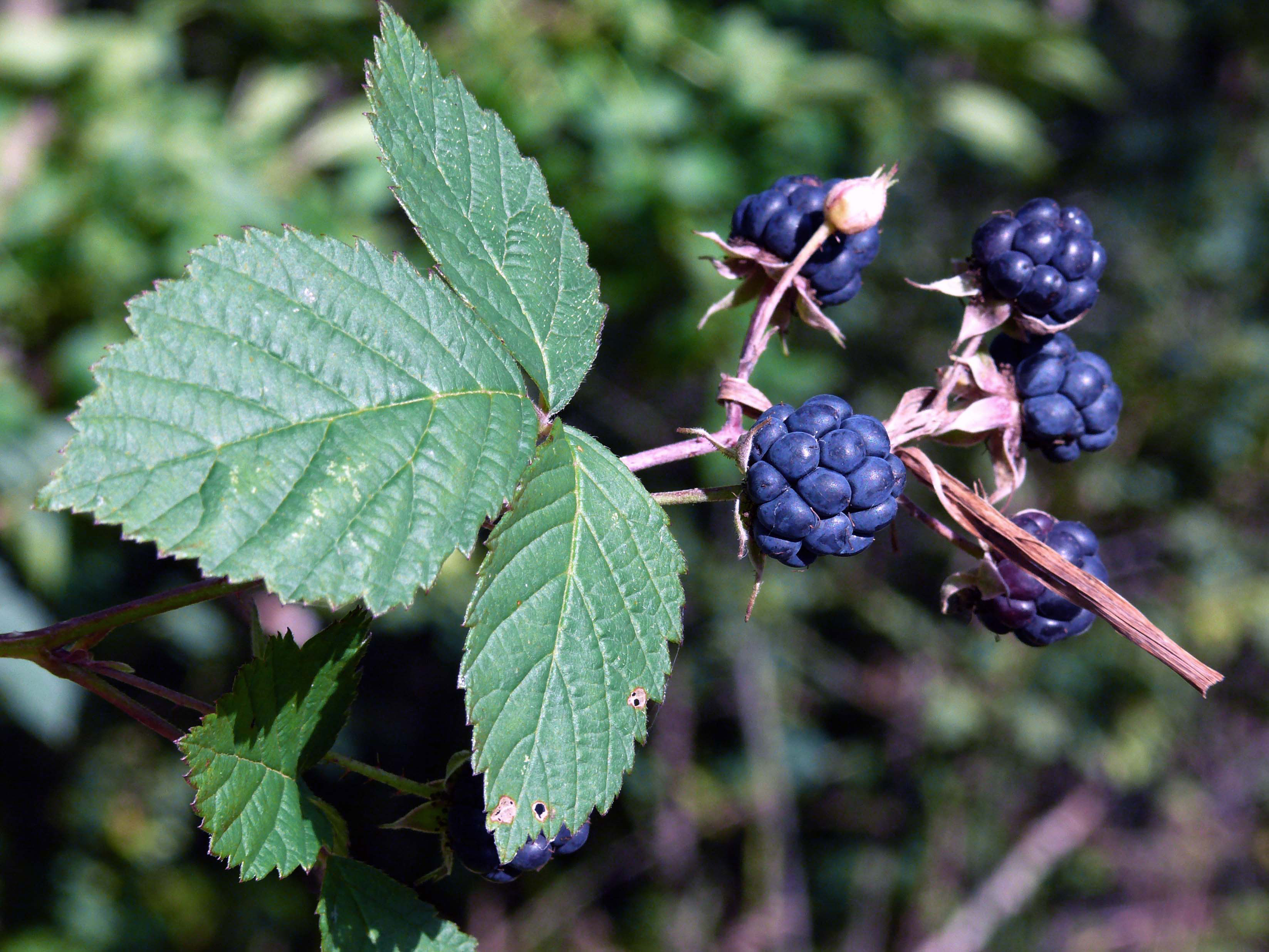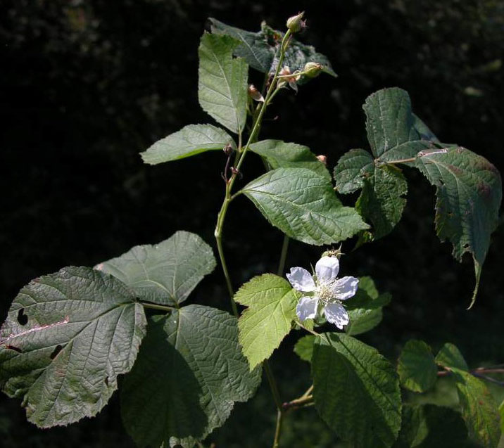 Dewberry is a small low-growing, deciduous shrub that normally grows about 2 m (6 ft. 7 in) tall with biennial stems which die after fruiting in their second year. It sends out long runners which root at the tip to form new plants. Rubus caesius is similar to and often confused with forms of Rubus fruticosus. The plant is found growing in hedgerows, amongst shrubs, in rough dry meadow land, forest margins, copices, rocky broad leaf woods, waterside thickets, roadsides, mid-successional dunes, riverbanks, valleys, ravines, streams, inundated meadows, gardens and orchards. The plant prefers light, medium and heavy soils, slightly acidic to basic and well-drained soil. The stems are bluish-grey and sometimes prickly. Cane is 1.5 m tall and 0.5-2 m long, armed with irregular sized prickles, greenish-yellow to brown, and glabrous to glabrescent.