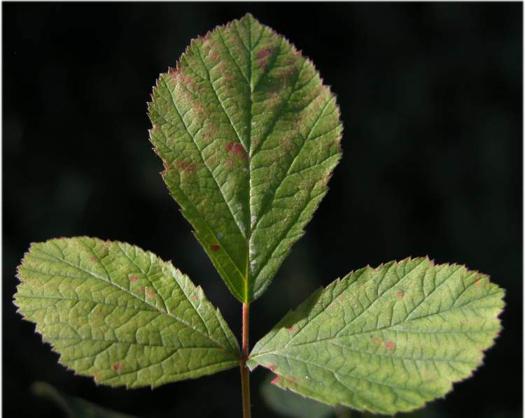The alternate leaves are hairy above and below. Petioles are 4-6 cm long, armed, and often glandular. The lanceolate stipules are 0.6-1 cm long and 0.2-0.3 cm broad, bearing hairs and marginal glands. The leaves are alternately arranged and trifoliate (rarely five). Each leaflet is thin, broadly ovate to almost round, 4-7 cm long and 3-7 cm broad, basally round, apically acute, with doubly serrate margins. Blade is somewhat pubescent, lighter green abaxially. The lateral leaflets are nearly sessile, while the terminal leaflets have a 1-2.5 cm long petiolule and are armed and glandular.