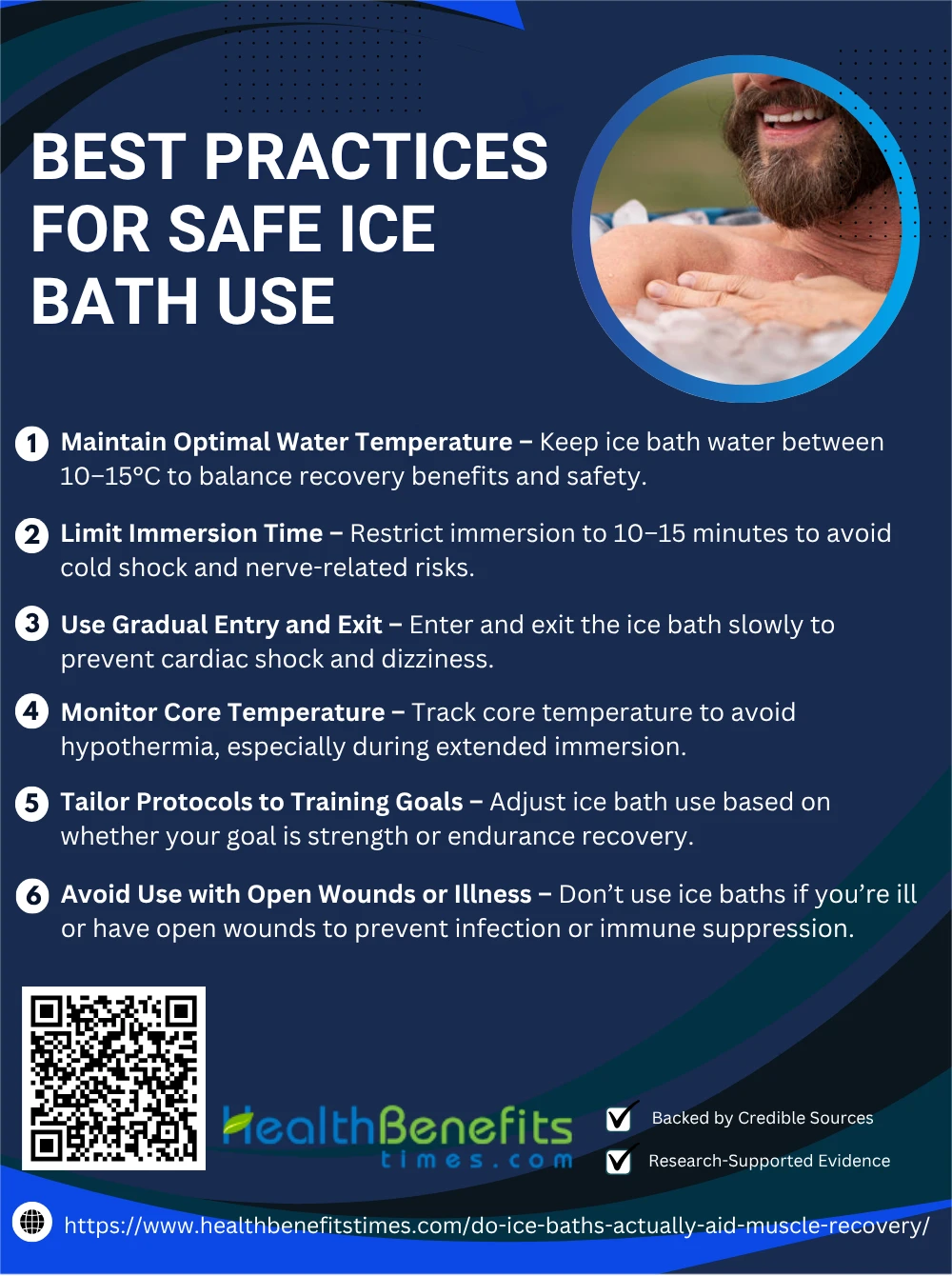 To use ice baths safely, follow best practices like maintaining water temperatures between 10–15°C, limiting immersion to 10–15 minutes, and avoiding use if you have circulatory or heart conditions.