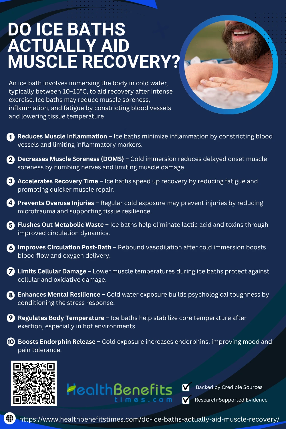 - Ice baths may reduce muscle soreness, inflammation, and fatigue by constricting blood vessels and lowering tissue temperature.
