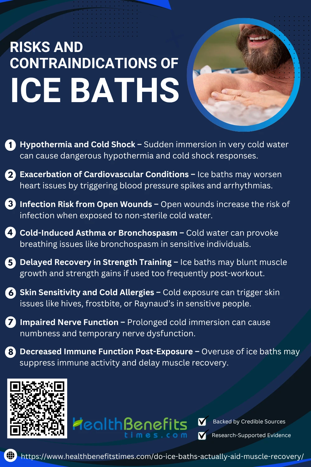 Ice baths carry risks such as hypothermia, numbness, and cardiovascular stress. They’re contraindicated for individuals with heart conditions, poor circulation, or cold sensitivity, requiring caution and medical advice before use.