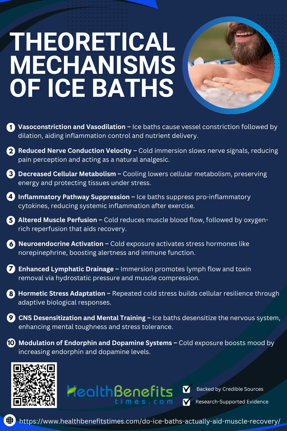 Ice baths are thought to aid recovery by constricting blood vessels, reducing inflammation, slowing nerve signals, and limiting tissue damage—mechanisms that may decrease soreness and promote faster muscle repair.