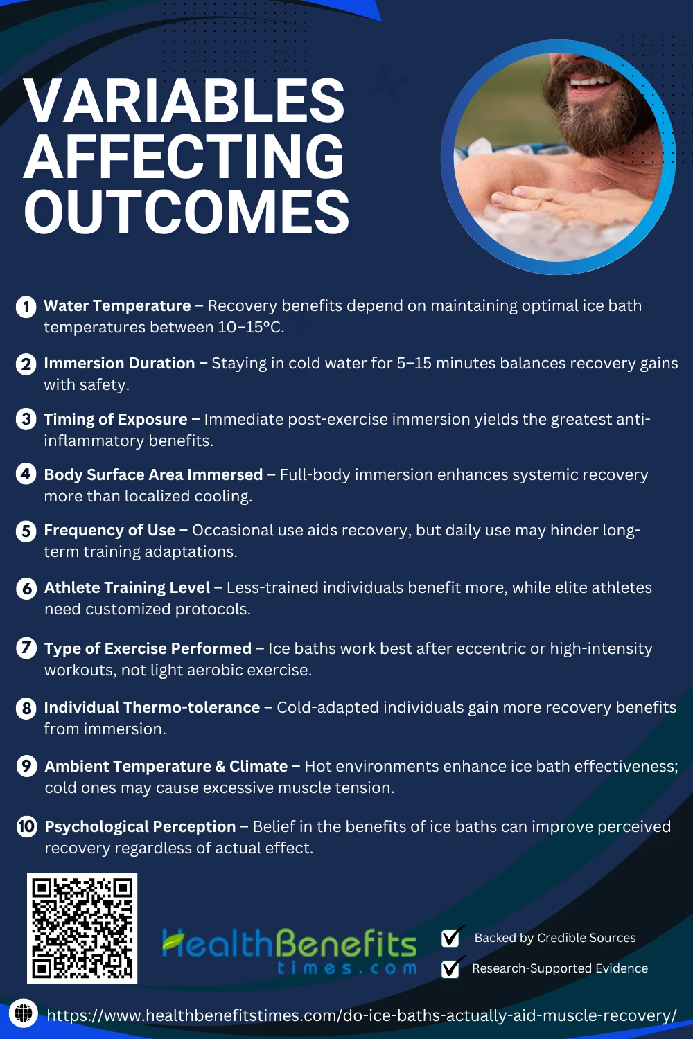 The effectiveness of ice baths depends on variables like water temperature, immersion duration, timing post-exercise, individual fitness level, and exercise intensity, all of which can influence muscle recovery and performance outcomes.