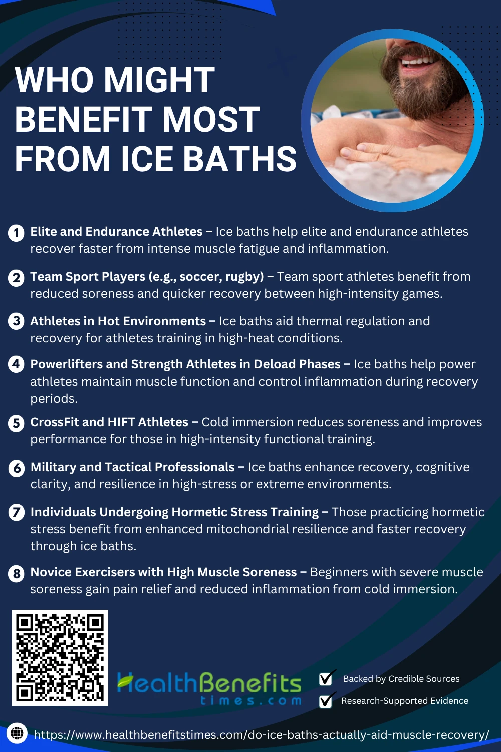 Ice baths may benefit elite athletes, endurance trainers, and individuals engaged in high-intensity workouts, as they experience greater muscle strain and may need quicker recovery to maintain performance levels.