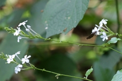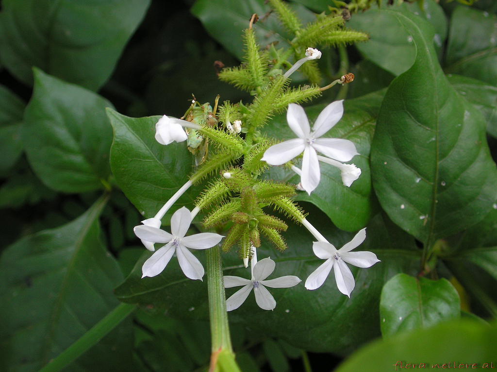 Flowers are white, about 10-25 cm long, inbracteate, axillary or terminal elongated spikes and bisexual. Calyx is covered with sticky and stalked glands. Corolla is white, slender and tubular.