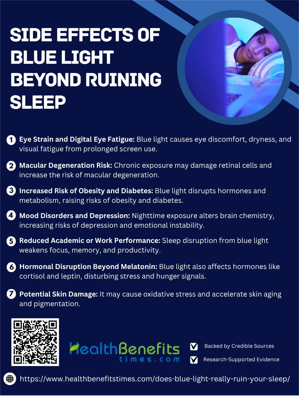 Blue light affects more than just sleep. Prolonged exposure may lead to digital eye strain, headaches, blurred vision, and even potential retinal damage, raising concerns about long-term eye health.