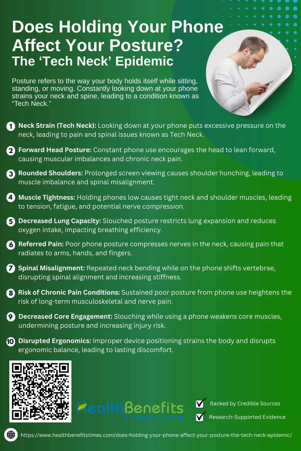 Holding your phone at a low angle forces your neck into a forward tilt, increasing the load on your cervical spine. This can lead to a condition known as Tech Neck, where pressure on the neck increases from 10-12 pounds to nearly 50 pounds when the head tilts at 45 degrees. This repetitive strain can affect the facet joints, irritate spinal discs, and lead to referred pain in the arms. (1) (2) Long-term effects may include nerve compression, headaches, and posture imbalance. (3)