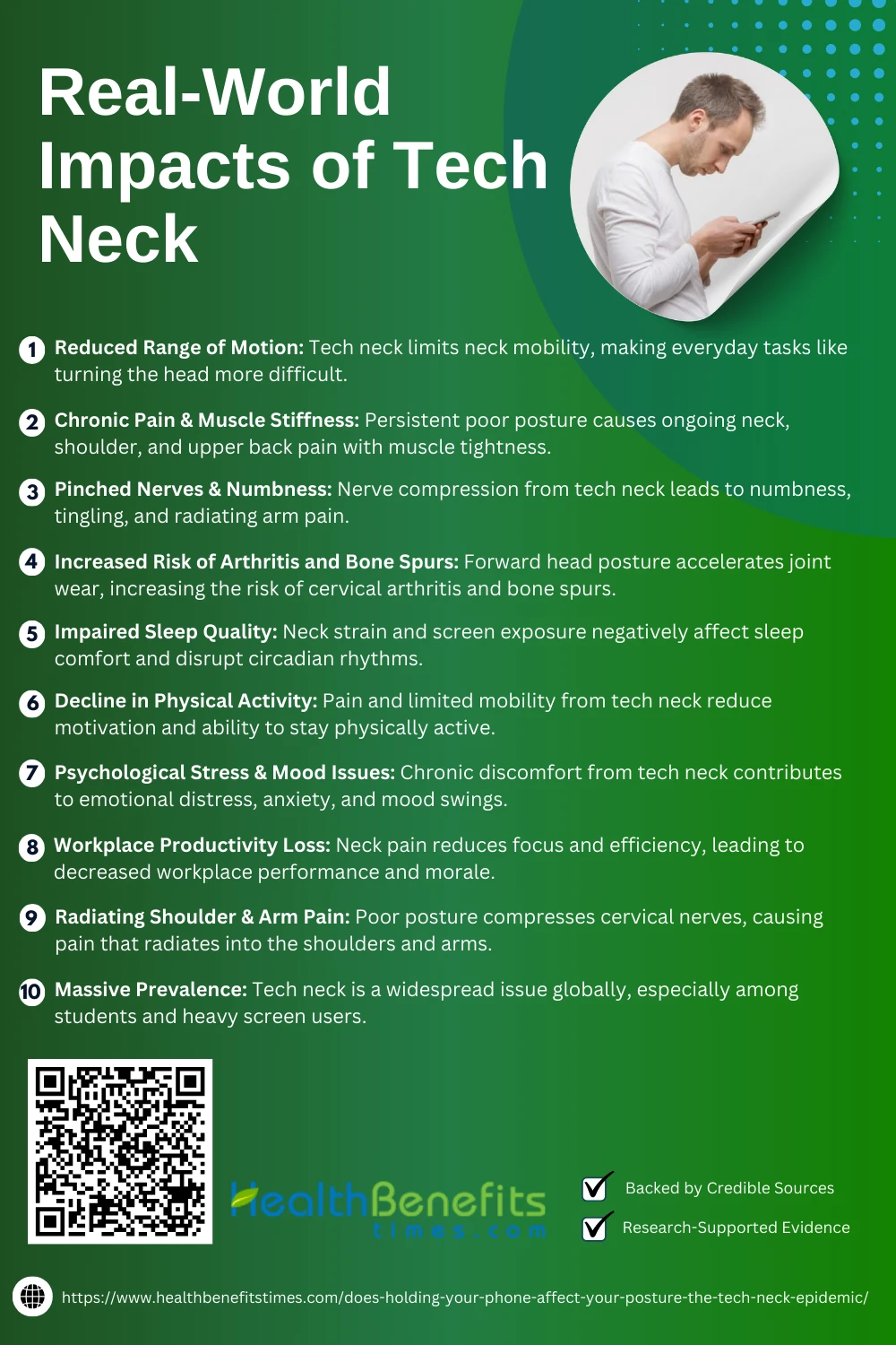 Tech neck can lead to chronic pain, reduced mobility, headaches, and long-term postural changes. These real-world impacts affect daily life, work performance, sleep quality, and overall physical and mental well-being.
