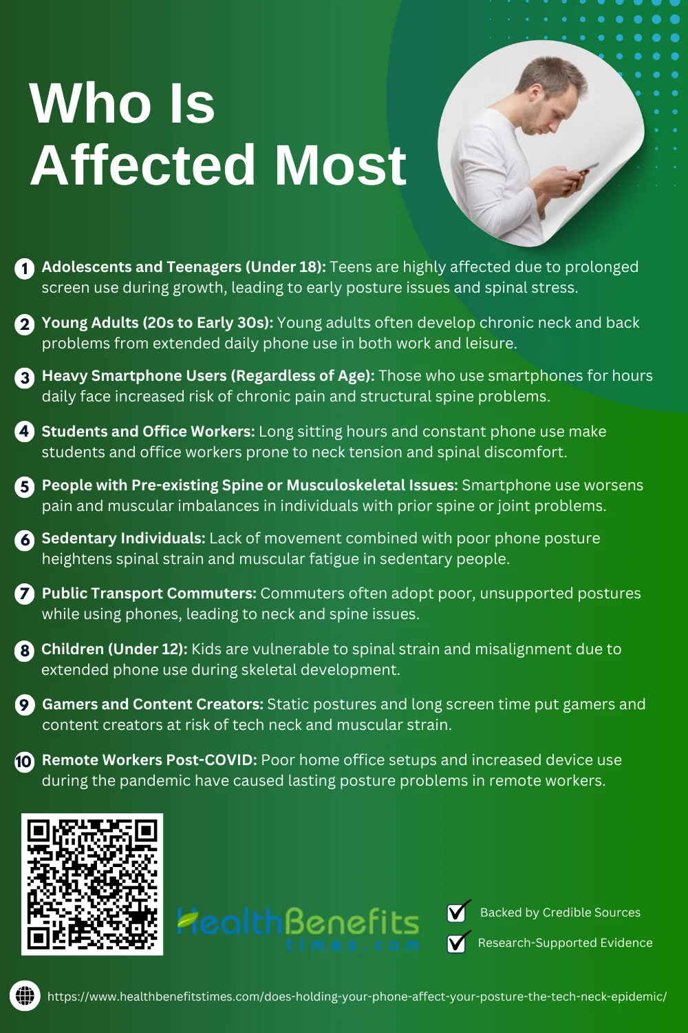 Individuals with pre-existing spinal or musculoskeletal conditions are more susceptible to worsened symptoms from poor smartphone posture. Sustained forward head positioning can aggravate cervical and lumbar spine issues, amplifying pain and stiffness. (14) Prolonged smartphone use may lead to referred pain in the shoulders, arms, and hands for those already vulnerable. (21) These individuals often experience exacerbated muscular imbalances and fatigue due to device overuse. (11)