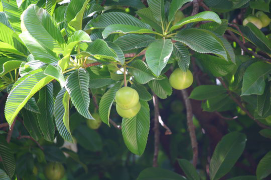 Elephant apple, binomially known as Dillenia indica is an evergreen large sized shrub that belongs to the Dilleniaceae family. The plant is native to southeastern Asia, from India, Bangladesh and Sri Lanka east to southwestern China (Yunnan) and Vietnam, and south through Thailand to Malaysia and Indonesia. Other Common names of the plant are Chulta, Hondapara Tree, Ma-tad, Elephant Apple, Simpoh Air, Simpoh Kuning, Simpuh, Chalta, Indian Simpoh, Chimpoh, Simpoh, Simpor, Peradun and Tipor. English name, elephant apple came from the fact that in its native range, it is quite popular fruit among local wild elephants. Fruits are enjoyed and distributed by wild elephants, thus the popular name Elephant Apple. Fruit can be consumed both in ripe and unripe stages, and it is normally used for making chutneys as well as other popular pickled dishes. Fruit comes into season during fall months, depending on the region, with maturity in October and November and a lengthier harvesting period from October through March.