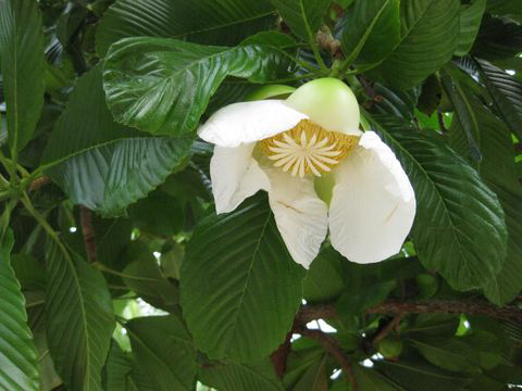 Flower Very large, robust, nodding, fragrant, white, 15–20 cm diameter, with 5, oval, boat-shaped, fleshy sepals, five white, broadly obovate petals and numerous whitish cream stamens in two whorls, outer curved and the inner whorl reflexed at the apex, carpels numerous with spreading, white stylar branches with the concave stigma at the tip. The flowers do not fully expand even during anthesis