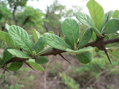 Emetic nut is a spiny, large deciduous thorny shrub or small tree that grows about 5 m tall. The plant is found growing in the foothills, scrub jungles, dry deciduous forests, monsoon forest understory and coastal sands. Branches are horizontal, rigid, paired spines sharp and woody. Lateral branchlets are short, suppressed. Leaves are simple, ovate, wrinkled, clustered, obovate-oval to spathulate, base tapered, obtuse to pointed apex, veins reticulate and sessile. Flowers are yellowish white, 1-3 at ends of suppressed branchlets. Fruits are 1.8-4.5 cm long, globose or broadly wide, longitudinally ribbed or smooth, crowned with persistent calyx limb. They are green when young turning to yellowish brown as they mature. Fruit consists of numerous seeds 0.4-0.6 cm long, compressed, smooth, brown and very hard. Since it is a medicitree it is used to treat cough, asthma, ulcers and many other ailments.