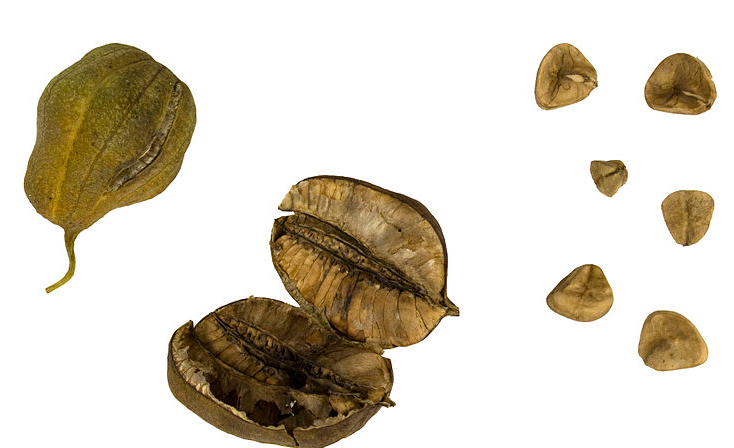 Pear-shaped fruit size of a nut and opens up in six flaps containing flat, triangular seeds.